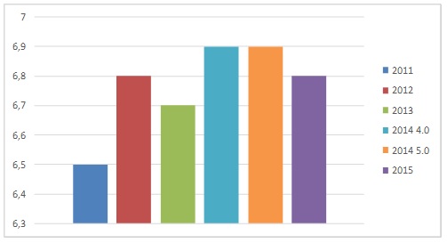 Figuur 1: Gemiddelde score governance in visitaties, 2011-2015