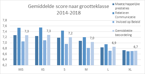 Opvallend is dat kleine corporaties door hun huurders beduidend beter worden beoordeeld dan de grote corporaties. Waar de kleine corporaties (XXS en XS: < 2.000 vhe) gemiddeld een 7,3 scoren moeten de grote corporaties (L, XL: > 10.000 vhe) het doen met een score onder de 7. Dit patroon zien we bij elk van de drie onderdelen.