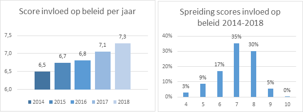 Over het algemeen zijn huurders behoorlijk tevreden over de mate waarin ze invloed hebben op het beleid van de corporatie. 70% van de corporaties krijgen hiervoor een 7 of hoger. Hier is de grootste verbetering zichtbaar: van een 6,5 in 2014 naar een 7,3 in 2018.